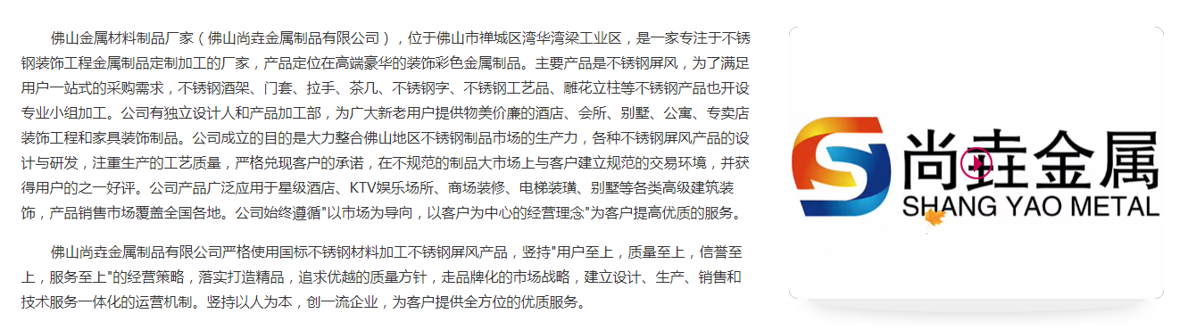 佛山金屬材料制品廠家(佛山尚垚金屬制品有限公司),位于佛山市禪城區灣華灣梁工業區,是一家專注于不銹鋼裝飾工程金屬制品定制加工的廠家,產品定位在豪華的裝飾彩色金屬制品。主要產品是不銹鋼屏風,為了滿足用戶一站式的采購需求,不銹鋼酒架、門套、拉手、茶幾、不銹鋼字、不銹鋼工藝品、雕花立柱等不銹鋼產品也開設專業小組加工。公司有獨立設計人和產品加工部,為廣大新老用戶提供物美價廉的酒店、會所、別墅、公寓、專賣店裝飾工程和家具裝飾制品。公司成立的目的是大力整合佛山地區不銹鋼制品市場的生產力,各種不銹鋼屏風產品的設計與研發,注重生產的工藝質量,嚴格兌現客戶的承諾,在不規范的制品大市場上與客戶建立規范的交易環境,并獲得用戶的之一好評。公司產品廣泛應用于酒店、KTV娛樂場所、商場裝修、電梯裝璜、別墅等各類建筑裝飾,產品銷售市場覆蓋各地。公司始終遵循;以市場為導向,以客戶為中心的經營理念;為客戶提高服務。