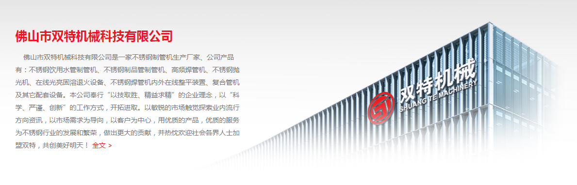 佛山市雙特機(jī)械科技有限公司是一家不銹鋼制管機(jī)生產(chǎn)廠家、公司產(chǎn)品有:不銹鋼飲用水管制管機(jī)、不銹鋼制品管制管機(jī)、高頻焊管機(jī)、不銹鋼拋光機(jī)、在線光亮固溶退火設(shè)備、不銹鋼焊管機(jī)內(nèi)外在線整平裝置、復(fù)合管機(jī)及其它配套設(shè)備。本公司奉行以技取勝、精益求精的企業(yè)理念,以科學(xué)、嚴(yán)謹(jǐn)、創(chuàng)新的工作方式,開拓進(jìn)取。以敏銳的市場觸覺探索業(yè)內(nèi)流行方向資訊,以市場需求為導(dǎo)向,以客戶為中心,好的服務(wù)為不銹鋼行業(yè)的發(fā)展和繁榮,做出更大的貢獻(xiàn),并熱忱歡迎社會(huì)各界人士加盟雙特,共創(chuàng)美好明天!