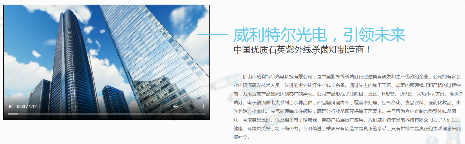 佛山市威利特爾光電科技有限公司,是紫外線燈行業具有研發和生產優勢的企業。公司擁有多名業內研發技術人員,先進的紫外線燈生產線十余條。通過先進的加工工藝、規范的管理模式和嚴格的過程控制,力求每支產品都能達到客戶的需求。公司產品形成了冷陰極、直管、H形管、U形管、大功率汞齊燈、電子鎮流器七大系列百余種品種,產品國內外,覆蓋水處理、空氣凈化、食品飲料、醫藥化妝品、水族養殖、小家電、廢氣處理等眾多領域,滿足各行業等工藝要求。并且可為客戶定制各類、高濃度臭氧燈、以及相關電子鎮流器,幫客戶拓展更廣應用。我們威利特爾光電科技有限公司為了人們生活健康、環境更美好,將不懈努力。與時俱進,秉承只有創造才是真正的享受,只有拼搏才是真正的生活理念來回報社會。