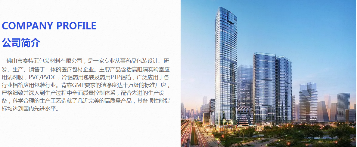 佛山市賽特菲包裝材料有限公司,是一家專業(yè)從事藥品包裝設(shè)計(jì)、研發(fā)、生產(chǎn)、銷售于一體的包材企業(yè)。主要產(chǎn)品含括高阻隔實(shí)驗(yàn)室應(yīng)用試劑膜,PVC/PVDC,冷鋁包裝及PTP鋁箔,廣泛應(yīng)用于各行業(yè)鋁箔應(yīng)用包裝行業(yè)。背靠GMP要求的潔凈度達(dá)十萬(wàn)級(jí)的標(biāo)準(zhǔn)廠房,嚴(yán)格細(xì)致并深入到生產(chǎn)過(guò)程中全面質(zhì)量控制體系,配合先進(jìn)的生產(chǎn)設(shè)備,科學(xué)合理的生產(chǎn)工藝造就了的高質(zhì)量產(chǎn)品,其各項(xiàng)性能指標(biāo)均達(dá)到國(guó)內(nèi)先進(jìn)水平。