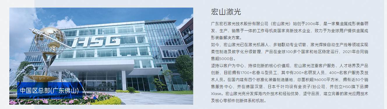 廣東宏石激光技術股份有限公司(宏山激光)始創于2006年,是一家集金屬成形裝備研發、生產、銷售于一體的工作母機類國家高新技術企業,致力于為用戶提供金屬成形裝備解決方案。