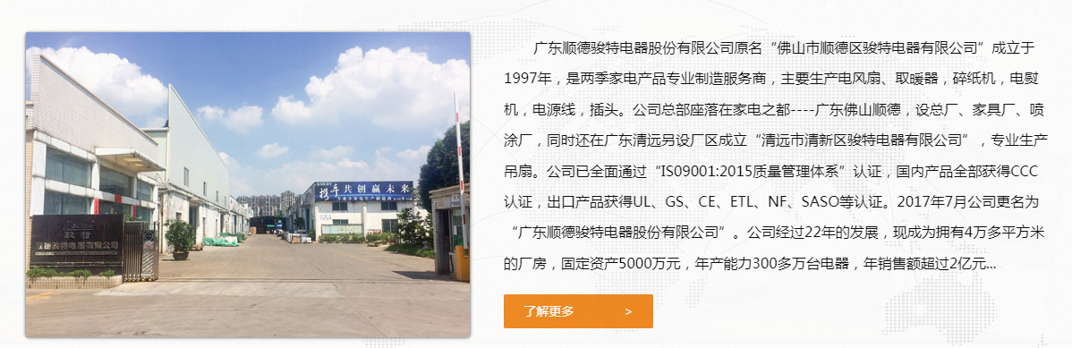 廣東順德駿特電器股份有限公司原名“佛山市順德區(qū)駿特電器有限公司”成立于1997年,是兩季家電產(chǎn)品專業(yè)制造服務(wù)商,主要生產(chǎn)電風(fēng)扇、取暖器,碎紙機,電熨機,電源線,插頭。公司總部座落在家電之都----廣東佛山順德,設(shè)總廠、家具廠、噴涂廠,同時還在廣東清遠另設(shè)廠區(qū)成立“清遠市清新區(qū)駿特電器有限公司”,專業(yè)生產(chǎn)吊扇。公司已全面通過“IS09001:2015質(zhì)量管理體系”認證,國內(nèi)產(chǎn)品全部獲得CCC認證,出口產(chǎn)品獲得UL、GS、CE、ETL、NF、SASO等認證。2017年7月公司更名為“廣東順德駿特電器股份有限公司”。公司經(jīng)過22年的發(fā)展,現(xiàn)成為擁有4萬多平方米的廠房,固定資產(chǎn)5000萬元,年產(chǎn)能力300多萬臺電器,年銷售額超過2億元,500多名員工。本公司擁有設(shè)計開發(fā),模具設(shè)計制造,注塑加工,五金加工,電機設(shè)計制造,電源線加工,五金噴涂,網(wǎng)罩加工,網(wǎng)圈加工,成品組裝一條龍的生產(chǎn)和設(shè)計能力。公司主要生產(chǎn)“駿特”“駱駝”系列產(chǎn)品,也是“美的”“澳柯瑪”“榮事達”“視貝”“松橋”“國美”“三峽”等品牌小家電ODM/OEM的生產(chǎn)基地。出口產(chǎn)品亞馬遜。為適應(yīng)國內(nèi)外市場的需求,把研制新產(chǎn)品,開發(fā)新項目,拓展新業(yè)務(wù)作為公司主要的發(fā)展方向,公司一貫重合同,守信用,并堅持客戶至上,以質(zhì)量求生存,信譽求發(fā)展的原則,以精益求精的務(wù)實精神,隨著經(jīng)濟一體化和市場日趨成熟,我們堅信:全心的付出,全新的感受,這是駿特人的承諾。公司將繼續(xù)推出更多更有時代特色的產(chǎn)品,為海內(nèi)外客戶提供更加好的服務(wù),攜手共創(chuàng)贏未來。