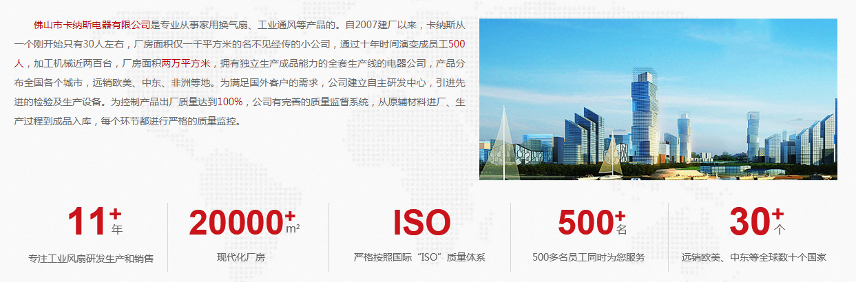 佛山市卡納斯電器有限公司是專業(yè)從事家用換氣扇、工業(yè)通風等產(chǎn)品的。自2007建廠以來,卡納斯從一個剛開始只有30人左右,廠房面積僅一千平方米的名不見經(jīng)傳的小公司,通過十年時間演變成員工500人,加工機械近兩百臺,廠房面積兩萬平方米,擁有獨立生產(chǎn)成品能力的全套生產(chǎn)線的電器公司,產(chǎn)品分布各個城市,遠銷多地。為滿足國外客戶的需求,公司建立自主研發(fā)中心,引進先進的檢驗及生產(chǎn)設備。為控制產(chǎn)品出廠質量好,公司有完善的質量監(jiān)督系統(tǒng),從原輔材料進廠、生產(chǎn)過程到成品入庫,每個環(huán)節(jié)都進行嚴格的質量監(jiān)控。