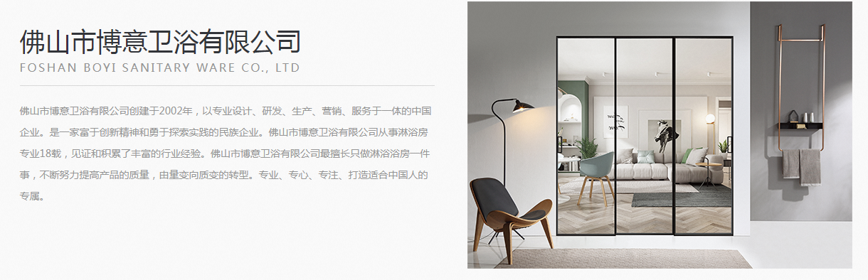佛山市博意衛浴有限公司創建于2002年,以專業設計、研發、生產、營銷、服務于一體的企業。是一家富于創新精神和勇于探索實踐的民族企業。佛山市博意衛浴有限公司從事淋浴房專業18載,見證和積累了豐富的行業經驗,公司主營淋浴房型材,不銹鋼淋浴房,淋浴房配件,淋浴房品牌,淋浴房廠家 ,整體淋浴房。佛山市博意衛浴有限公司擅長只做淋浴浴房一件事,不斷努力提高產品的質量,由量變向質變的轉型。專業、專心、專 注、打造適合國人的專屬。