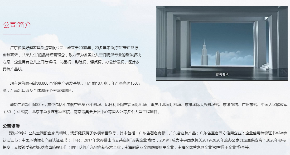 廣東省澳舒健家具制造有限公司,成立于2000年,20多年來秉持著“守正篤行,共榮共生”的品牌經營理念,致力于為各類公共空間提供專業的整體解決方案,企業擁有公共空間等候椅、禮堂椅、影院椅、課桌椅、辦公沙發椅、家具等產品線。
