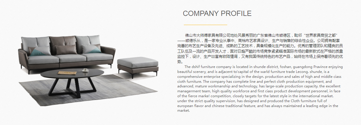 佛山市大師傅家具有限公司地處風景秀麗的廣東省佛山市順德區(qū),毗鄰“世界家具商貿之都”——順德樂從,是一家專業(yè)從事中、布藝家具設計、生產與銷售的綜合性企業(yè)。公司擁有配套完善的布藝生產設備及先進、成熟的工藝技術,具備規(guī)?;a的能力。管理團隊和精良的員工隊伍的產品開發(fā)人才,面對日趨嚴酷的市場競爭緊緊瞄準市場的新款式在嚴格的質量監(jiān)控下,設計、生產出富有歐陸情調,又有我國傳統特色的布藝產品,始終在市場上保持著優(yōu)勢。