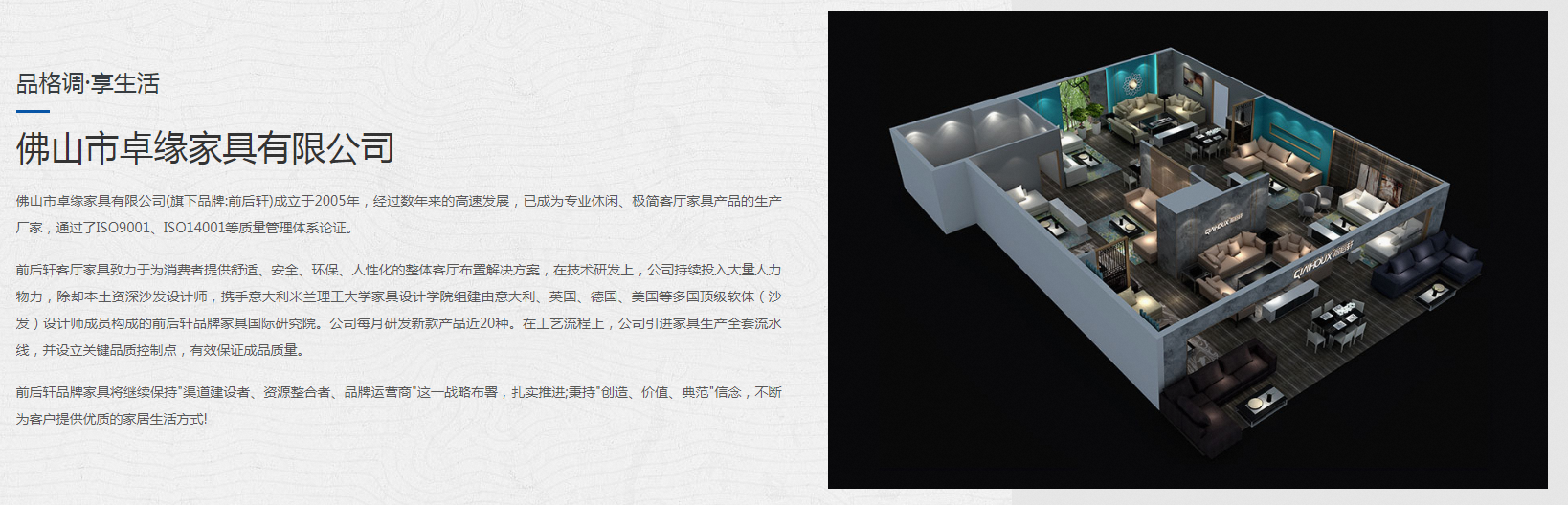 佛山市卓緣家具有限公司(旗下品牌:前后軒)成立于2005年,經(jīng)過數(shù)年來的高速發(fā)展,已成為專業(yè)休閑、客廳家具產(chǎn)品的生產(chǎn)廠家,通過了ISO9001、ISO14001等質(zhì)量管理體系論證。