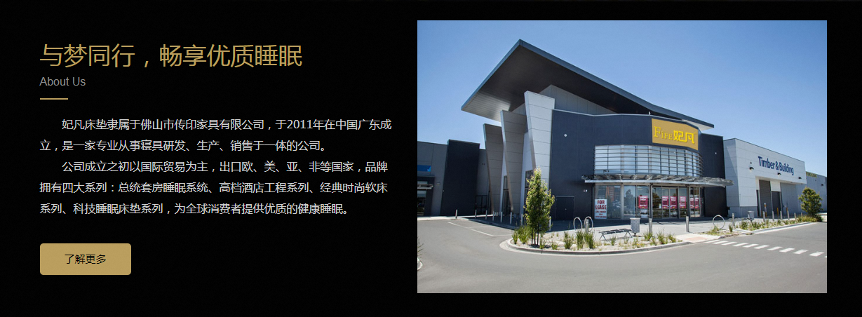 公司成立之初以貿易為主,出口歐、美、亞、非等國家,品牌擁有四大系列:總統套房睡眠系統、酒店工程系列、經典時尚軟床系列、科技睡眠床墊系列,為消費者提供的健康睡眠。