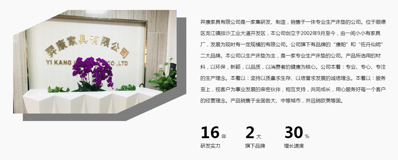 羿康家具有限公司是一家集研發、制造,銷售于一體專業生產床墊的公司。位于順德區龍江鎮排沙工業大道開發區,本公司創立于2002年9月至今,由一間小小有家具廠,發展為現時有規模的有限公司。公司旗下有品牌的“康帕”和“佐丹仙妮”二品牌。本公司以生產床墊為主,是一家專業生產床墊的公司。產品所選用的材料,以新穎,以品質,以消費者的健康為核心。公司本著:專業、專心、專注的生產理念。本著以:堅持以質量求生存、以信譽求發展的誠信理念。本著以:服務至上,視客戶為事業發展的親密伙伴,相互支持,共同成長,用心服務好每一個客戶的經營理念。產品銷售于各大、中等城市,并遠銷多國。