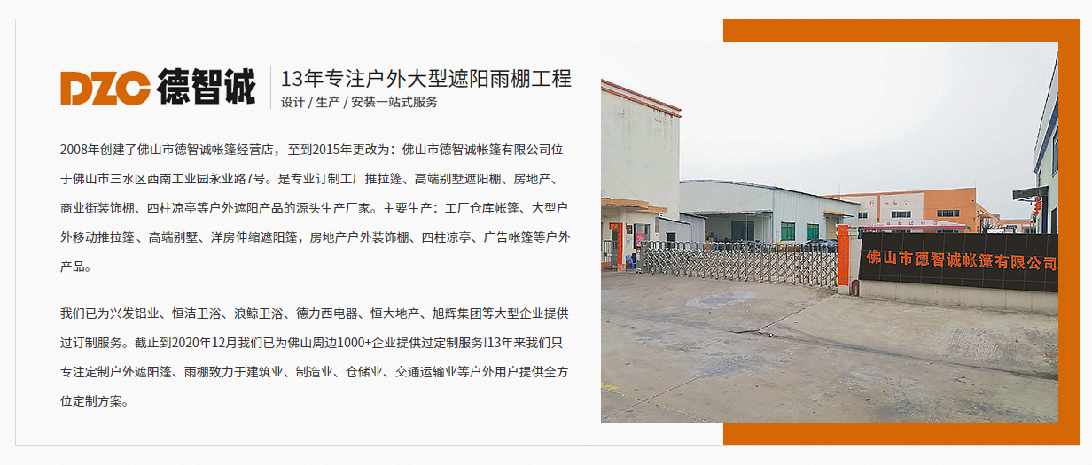 2008年創(chuàng)建了佛山市德智誠(chéng)帳篷經(jīng)營(yíng)店, 至到2015年更改為:佛山市德智誠(chéng)帳篷有限公司位于佛山市三水區(qū)西南工業(yè)園永業(yè)路7號(hào)。是專業(yè)訂制工廠推拉篷、別墅遮陽棚、房地產(chǎn)、商業(yè)街裝飾棚、四柱涼亭等戶外遮陽產(chǎn)品的源頭生產(chǎn)廠家。主要生產(chǎn):工廠倉庫帳篷、大型戶外移動(dòng)推拉篷 、別墅、洋房伸縮遮陽篷,房地產(chǎn)戶外裝飾棚、四柱涼亭、廣告帳篷等戶外產(chǎn)品。