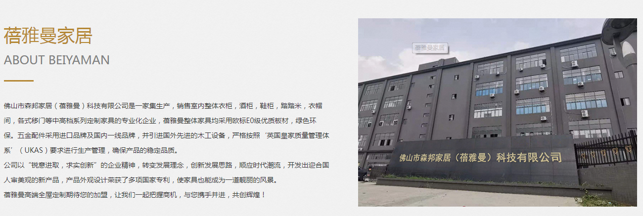 佛山市森邦家居(蓓雅曼)科技有限公司是一家集生產(chǎn),銷售室內(nèi)整體衣柜,酒柜,鞋柜,踏踏米,衣帽間,各式移門等系列定制家具的專業(yè)化企業(yè),蓓雅曼整體家具均采用歐標(biāo)E0級質(zhì)優(yōu)板材。五金配件采用進(jìn)口品牌及國內(nèi)品牌,并引進(jìn)國外先進(jìn)的木工設(shè)備,嚴(yán)格按照(UKAS)要求進(jìn)行生產(chǎn)管理,確保產(chǎn)品的穩(wěn)定品質(zhì)。