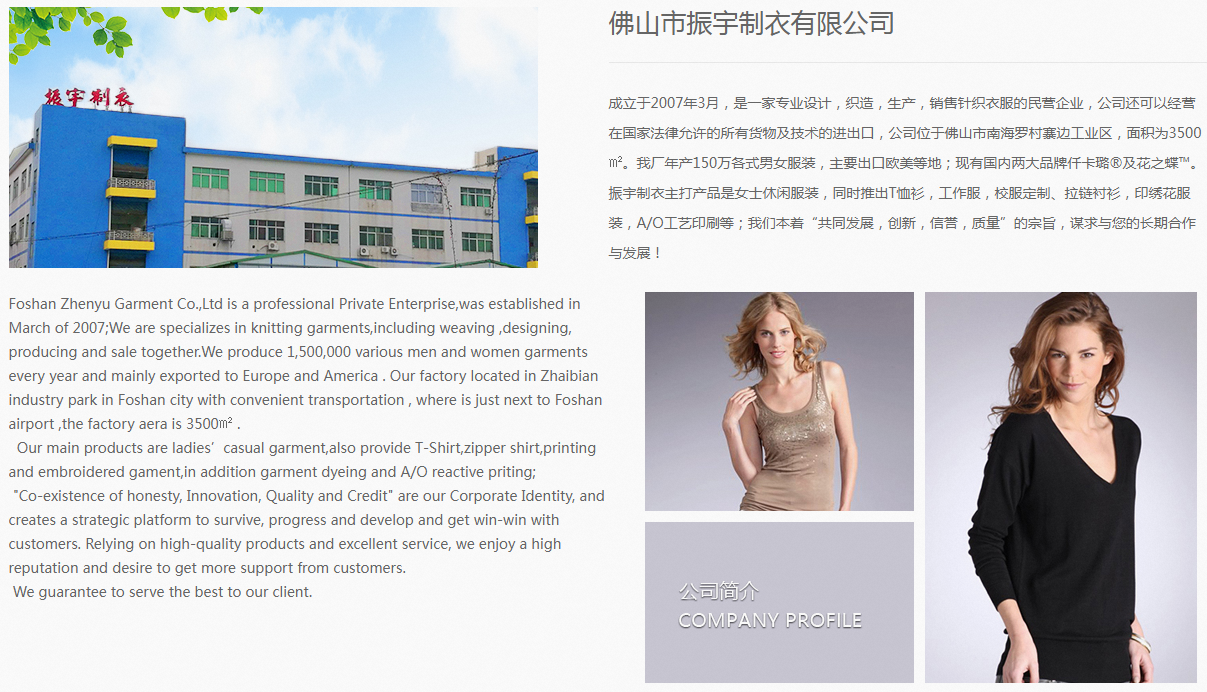 佛山市振宇制衣有限公司成立于2007年3月,是一家專業設計,織造,生產,銷售針織衣服的民營企業,公司還可以經營在國家法律允許的所有貨物及技術的進出口,公司位于佛山市南海羅村寨邊工業區,面積為3500㎡。我廠年產150萬各式男女服裝,主要出口;現有國內兩品牌仟卡璐?及花之蝶?。