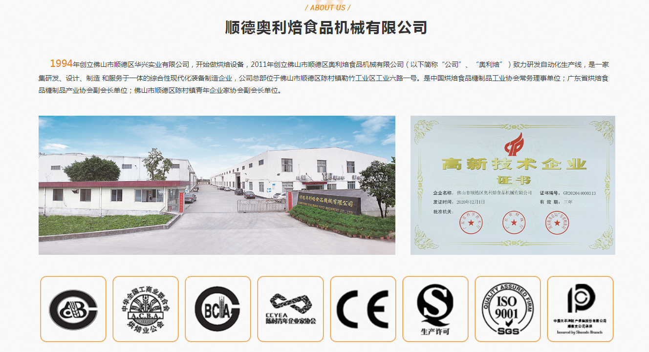 歷經(jīng)17年的務(wù)實(shí)進(jìn)取,于2011年成立了佛山市順德區(qū)奧利焙食品機(jī)械有限公司。逐步開發(fā)出全自動(dòng)烘焙生產(chǎn)線、全自動(dòng)型隧道爐、冷卻塔、熱風(fēng)旋轉(zhuǎn)爐、熱風(fēng)循環(huán)爐等一系列的專業(yè)烘焙生產(chǎn)設(shè)備,生產(chǎn)力不斷提升。公司當(dāng)選為焙烤食品糖制品工業(yè)協(xié)會(huì)理事會(huì)常務(wù)理事單位,同年被評(píng)為產(chǎn)品質(zhì)量監(jiān)督抽查合格企業(yè)。被評(píng)為高新技術(shù)企業(yè)、生產(chǎn)標(biāo)準(zhǔn)化三級(jí)企業(yè)(機(jī)械),同年成為土木工程學(xué)會(huì)燃?xì)夥謺?huì)商用燃具委員會(huì)會(huì)員單位。被評(píng)為改革開放40年廣東省烘焙行業(yè)先進(jìn)單位、改革開放40周年烘焙食品糖制品,同年在廣東省烘焙企業(yè)百?gòu)?qiáng)評(píng)選中獲選烘焙設(shè)備企業(yè)10強(qiáng)企業(yè)。2020年公司被重新認(rèn)定為國(guó)家高新技術(shù)企業(yè)。