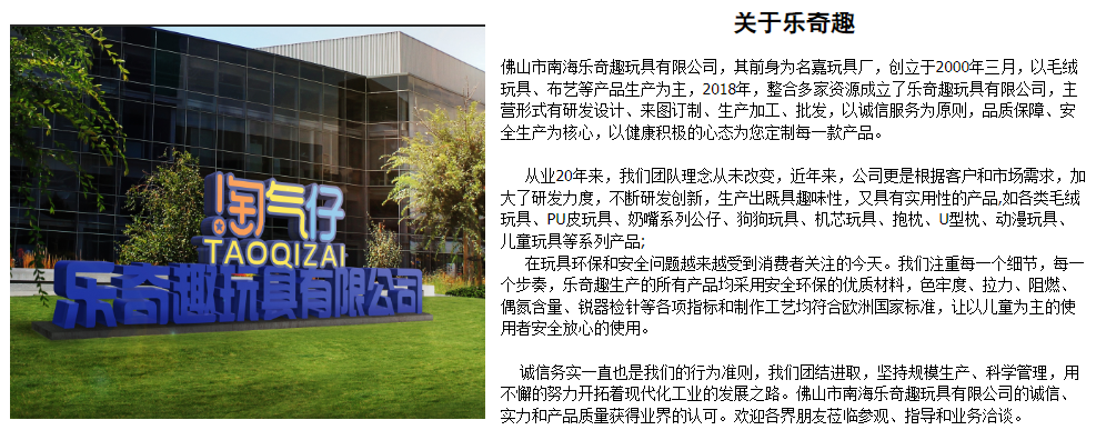 佛山市南海樂奇趣玩具有限公司,其前身為名嘉玩具廠,創立于2000年三月,以毛絨玩具、布藝等產品生產為主,2018年,整合多家資源成立了樂奇趣玩具有限公司,主營形式有研發設計、來圖訂制、生產加工、批發,以誠信服務為原則,生產為核心,以健康積極的心態為您定制每一款產品。