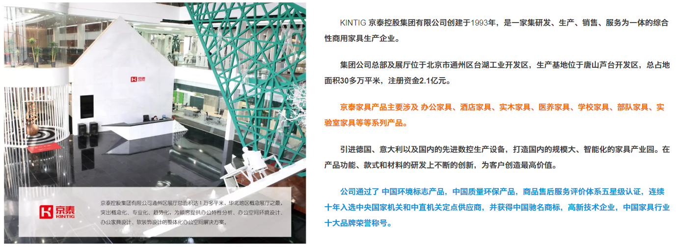 KINTIG 京泰控股集團(tuán)有限公司創(chuàng)建于1993年,是一家集研發(fā)、生產(chǎn)、銷售、服務(wù)為一體的綜合性商用家具生產(chǎn)企業(yè)。