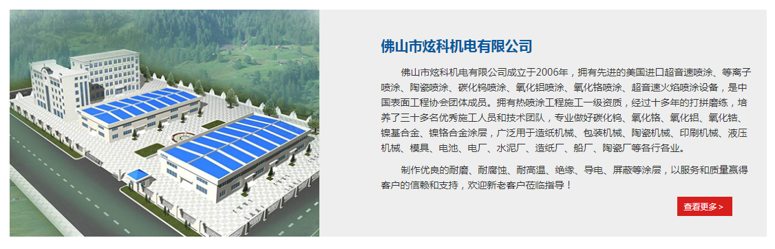 佛山市炫科機電有限公司成立于2006年,擁有超音速噴涂、等離子噴涂、電弧噴涂、火焰噴涂設備、碳化鎢噴涂,是表面工程協會團體成員。擁有熱噴涂工程施工資質,經過十多年的打拼磨練,培養了三十多名施工人員和技術團隊,專業做好碳化鎢、氧化鉻、氧化鋁、氧化鋯、鎳基合金、鎳鉻合金涂層,廣泛用于造紙機械、包裝機械、陶瓷機械、印刷機械、液壓機械、模具、電池、電廠、水泥廠、造紙廠、船廠、陶瓷廠等各行各業。