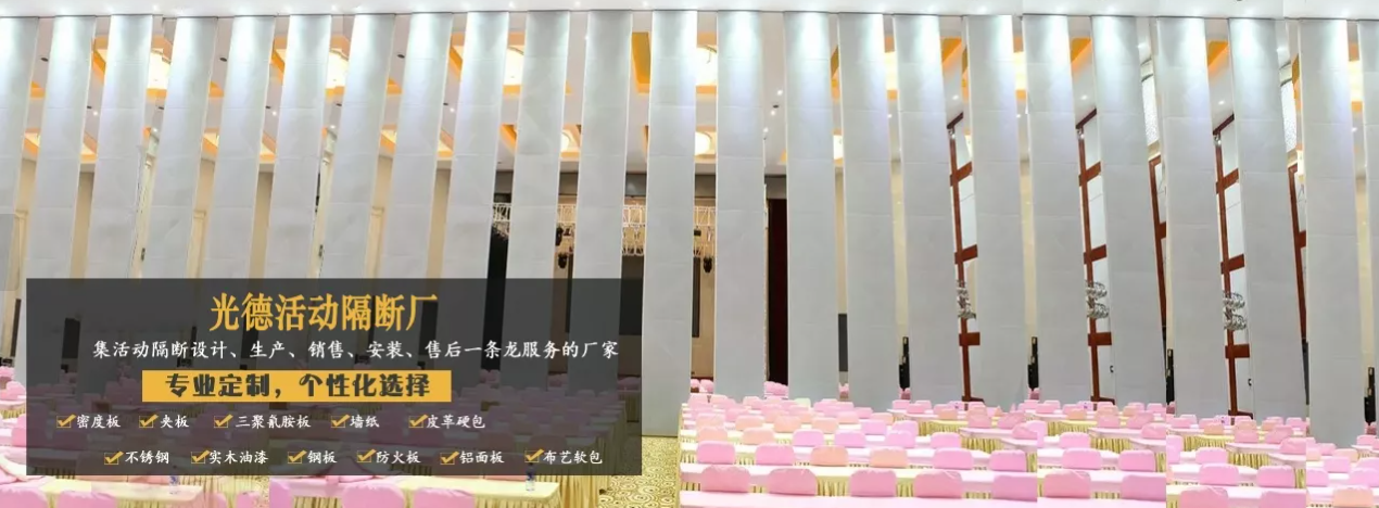 公司自成立以來一直致力于隔斷技術(shù)的研發(fā),以高超的研發(fā)技術(shù)、嚴(yán)謹(jǐn)?shù)脑O(shè)計(jì)方案、先進(jìn)的生產(chǎn)設(shè)備、好的制作工藝、科學(xué)的質(zhì)量管理體系、嚴(yán)格的檢驗(yàn)流程、齊全的產(chǎn)品系統(tǒng)規(guī)格、好的施工水平、好的售后服務(wù)等,為客戶量身定制多樣化隔斷產(chǎn)品,我們主要生產(chǎn)65型活動(dòng)隔斷、80型活動(dòng)隔斷、85型活動(dòng)隔斷、100型活動(dòng)隔斷、125型高隔音雙層活動(dòng)隔斷、電動(dòng)型自動(dòng)活動(dòng)隔斷、單(雙)玻活動(dòng)隔斷等系列產(chǎn)品。光德屏風(fēng)具有防刮、防蛀、防潮、抗裂、堅(jiān)固不變形、易拆裝、時(shí)尚美觀等特點(diǎn),廣泛用于醫(yī)院、學(xué)校、銀行、酒店、餐廳、會(huì)議室,畫展中心,宴會(huì)廳等場(chǎng)所。
