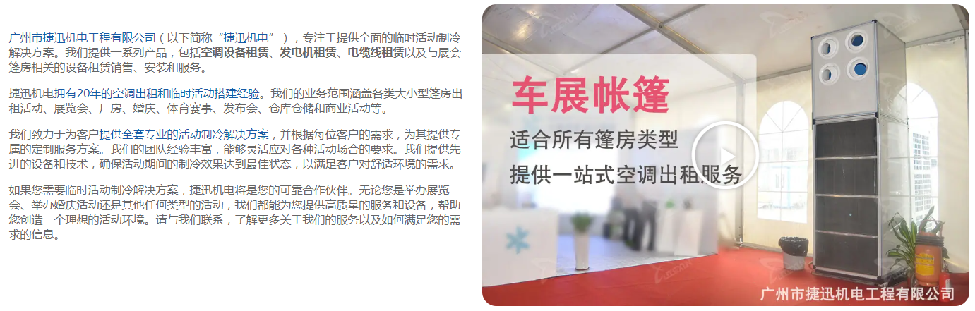 廣州市捷迅機電工程有限公司(以下簡稱“捷迅機電”),專注于提供全面的臨時活動制冷解決方案。我們提供一系列產品,包括空調設備租賃、發電機租賃、電纜線租賃以及與展會篷房相關的設備租賃銷售、安裝和服務。