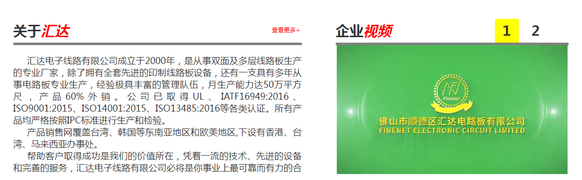 匯達電子線路有限公司成立于2000年,是從事雙面及多層線路板生產的專業廠家,除了擁有全套先進的印制線路板設備,還有一支具有多年從事電路板專業生產,經驗豐富的管理隊伍,月生產能力達50萬平方尺,產品60%外銷。公司已取得UL、IATF16949:2016、ISO9001:2015、ISO14001:2015、ISO13485:2016等各類認證。所有產品均嚴格按照IPC標準進行生產和檢驗。